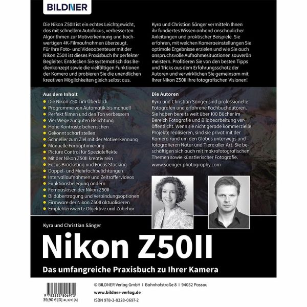 Für Ihre Foto- und Videoabenteuer mit der Nikon Z50II ist dieses Praxisbuch Ihr perfekter Begleiter. Entdecken Sie systematisch das Bedienkonzept sowie die vielfältigen Funktionen der Kamera und probieren Sie die unendlichen kreativen Möglichkeiten gleich selbst aus. Kyra und Christian Sänger vermitteln Ihnen ihr fundiertes Wissen anhand anschaulicher Anleitungen und praktischer Beispiele. Sie erfahren, mit welchen Kameraeinstellungen Sie optimale Ergebnisse erzielen und wie Sie auch anspruchsvolle Aufnahmesituationen souverän meistern. Profitieren Sie von den besten Tipps und Tricks aus dem Erfahrungsschatz der Autoren und verwirklichen Sie gemeinsam mit Ihrer Nikon Z50II Ihre fotografischen Visionen!