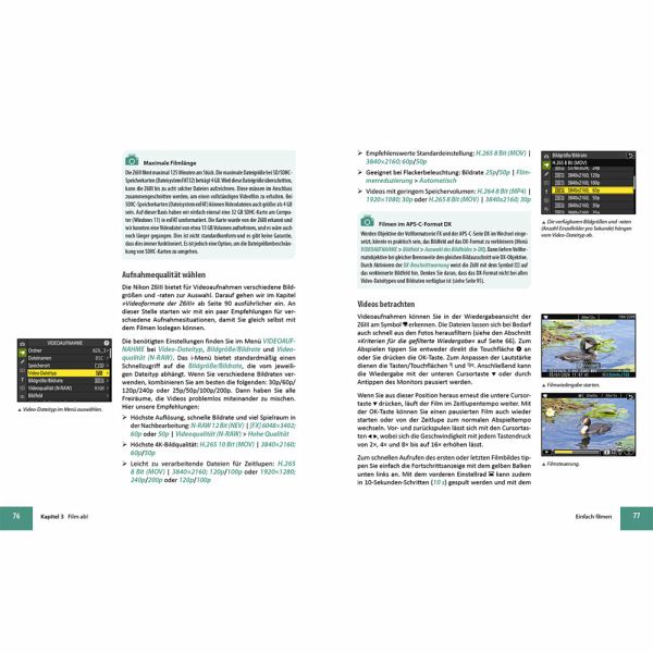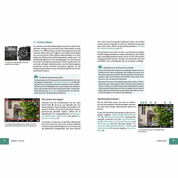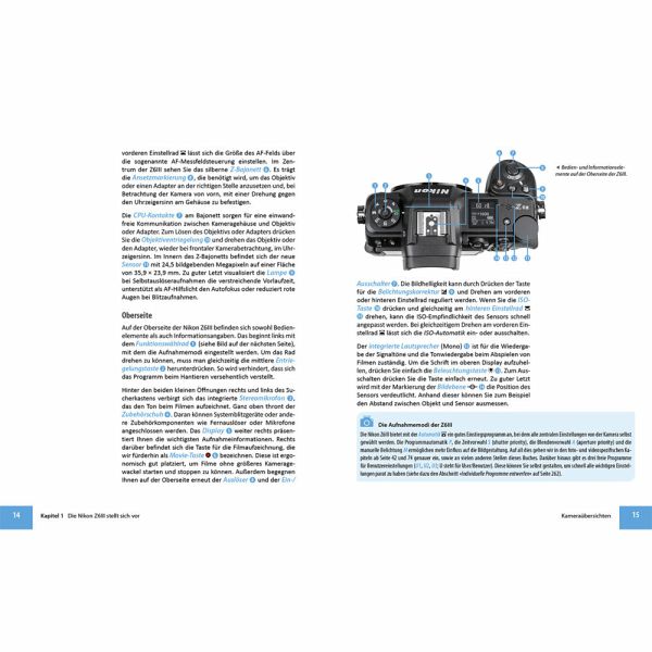 Die Nikon Z6III stellt sich vorWissenswertes zu Sucher und DisplaySystematisch zur gekonnten KamerabedienungVon der Programmautomatik bis zur manuellen BelichtungStrategien für eine präzise FokussierungSchnelle Bewegungen sicher erfassenVier Wege zur optimalen BelichtungAußergewöhnliche Kontraste managenFarbkontrolle mit idealem WeißabgleichPicture Control einsetzen und bearbeitenKreative Lichtgestaltung mit dem BlitzBesondere Herausforderungen meisternDie Kunst des perfekten FilmensBildbearbeitung, WLAN & Tethered-ShootingObjektive und spannendes Zubehör