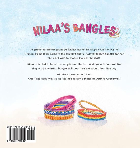 As promised, Nilaa's grandpa fetches her on his bicycle. On the way to Grandma's, he takes Nilaa to the temple's chariot festival to buy bangles for her. She can't wait to choose them at the stalls. Nilaa is thrilled to be at the temple, and the surroundings look carnival-like. They walk towards a bangle stall. Just then she spots a lost little boy. Will she choose to help him? And if she does, will she be too late to buy bangles to wear to Grandma's?