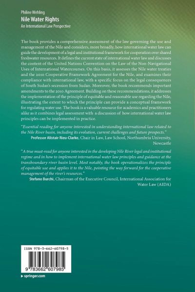 The book provides a comprehensive assessment of the law governing the use and management of the Nile and considers, more broadly, how international water law can guide the development of a legal and institutional framework for cooperation over shared freshwater resources. It defines the current state of international water law and discusses the content of the United Nations Convention on the Law of the Non-Navigational Uses of International Watercourses. On this basis, it assesses the Nile water treaties and the 2010 Cooperative Framework Agreement for the Nile, and examines their compliance with international law, with a specific focus on the legal consequences of South Sudan's secession from Sudan. Moreover, the book recommends important amendments to the 2010 Agreement. Building on these recommendations, it addresses the implementation of the principle of equitable and reasonable use regarding the Nile, illustrating the extent to which the principle can provide a conceptual framework for regulating water use. The book is a valuable resource for academics and practitioners alike as it combines legal assessment with a discussion of how international water law principles can be implemented in practice.