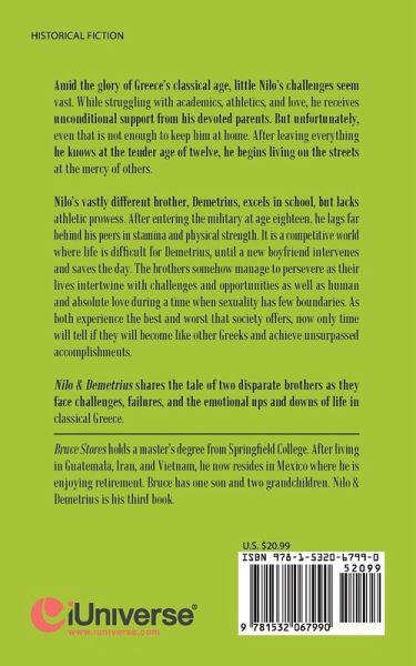 Amid the glory of Greece's classical age, little Nilo's challenges seem vast. While struggling with academics, athletics, and love, he receives unconditional support from his devoted parents. But unfortunately, even that is not enough to keep him at home. After leaving everything he knows at the tender age of twelve, he begins living on the streets at the mercy of others. Nilo's vastly different brother, Demetrius, excels in school, but lacks athletic prowess. After entering the military at age eighteen, he lags far behind his peers in stamina and physical strength. It is a competitive world where life is difficult for Demetrius, until a new boyfriend intervenes and saves the day. The brothers somehow manage to persevere as their lives intertwine with challenges and opportunities as well as human and absolute love during a time when sexuality has few boundaries. As both experience the best and worst that society offers, now only time will tell if they will become like other Greeks and achieve unsurpassed accomplishments. Nilo & Demetrius shares the tale of two disparate brothers as they face challenges, failures, and the emotional ups and downs of life in classical Greece.