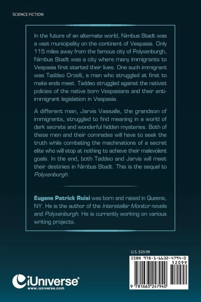 In the future of an alternate world, Nimbus Stadt was a vast municipality on the continent of Vespasia. Only 115 miles away from the famous city of Polyxenburgh, Nimbus Stadt was a city where many immigrants to Vespasia first started their lives. One such immigrant was Taddeo Orzelli, a man who struggled at first to make ends meet. Taddeo struggled against the nativist policies of the native born Vespasians and their anti-immigration legislation in Vespasia. A different man, Jarvis Vassalle, the grandson of immigrants, struggled to find meaning in a world of dark secrets and wonderful hidden mysteries. Both of these men and their comrades will have to seek the truth while combating the machinations of a secret elite who will stop at nothing to achieve their malevolent goals. In the end, both Taddeo and Jarvis will meet their destinies in Nimbus Stadt. This is the sequel to Polyxenburgh.