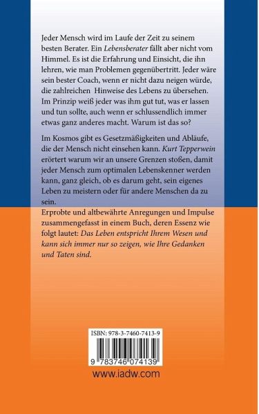 Jeder Mensch wird im Laufe der Zeit zu seinem besten Berater. Ein Lebensberater fällt aber nicht vom Himmel. Es ist die Erfahrung und Einsicht, die ihn lehren, wie man Problemen gegenübertritt. Jeder wäre sein bester Coach, wenn er nicht dazu neigen würde, die zahlreichen Hinweise des Lebens zu übersehen. Im Prinzip weiß jeder, was ihm gut tut, was er lassen und tun sollte, auch wenn er schlussendlich immer etwas ganz anderes macht. Warum ist das so?Im Kosmos gibt es Gesetzmäßigkeiten und Abläufe, die der Mensch nicht einsehen kann. Kurt Tepperwein erörtert, warum wir an unsere Grenzen stoßen, damit jeder Mensch zum optimalen Lebenskenner werden kann, ganz gleich, ob es darum geht, sein eigenes Leben zu meistern oder für andere Menschen da zu sein.Erprobte und altbewährte Anregungen und Impulse zusammengefasst in einem Buch, deren Essenz wie folgt lautet: Das Leben entspricht Ihrem Wesen und kann sich immer nur so zeigen, wie Ihre Gedanken und Taten sind.