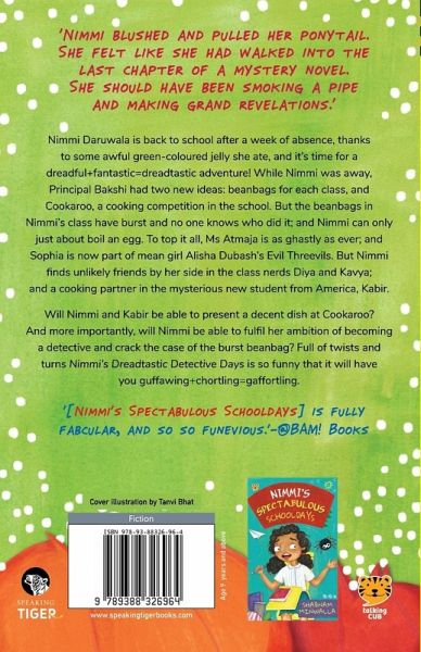 Nimmi Daruwala is back with a dreadful+fantastic=dreadtastic adventure! Nimmi Daruwala is back to school after a week of absence, thanks to some awful green-coloured jelly she ate, and it's time for a dreadful+fantastic=dreadtastic adventure! While Nimmi was away, Principal Bakshi had two new ideas: beanbags for each class, and Cookaroo, a cooking competition in the school. But the beanbags in Nimmi's class have burst and no one knows who did it; and Nimmi can only just about boil an egg. To top it all, Ms Atmaja is as ghastly as ever; and Sophia is now part of mean girl Alisha Dubash's Evil Threevils. But Nimmi finds unlikely friends by her side in the class nerds Diya and Kavya;and a cooking partner in the mysterious new student from America, Kabir. Will Nimmi and Kabir be able to present a decent dish at Cookaroo? And more importantly, will Nimmi be able to fulfil her ambition of becoming a detective and crack the case of the burst beanbag? Full of twists and turns Nimmi's Dreadtastic Detective Days is so funny that it will have you guffawing+chortling=gaffortling.