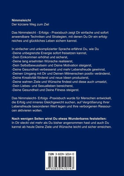 NIMMSLEICHT Der kürzere Weg zum Ziel Das NIMMSLEICHT Erfolgsbuch wurde für Menschen entwickelt, die Erfolg und inneres Gleichgewicht suchen, auf Vergrößerung Ihrer Lebensfreude besonderen Wert legen und Ihre verborgenen Ressourcen aktivieren wollen. Mit den einfachen und sofort anwendbaren Techniken und Strategien können Sie sich heute noch auf Erfolg programmieren und Ihre lang ersehnten Wünsche erfüllen. Entfallten Sie endlich ihre wahren Kräfte - Ihre schlummernden Fähigkeiten und Talente - und sehen Sie selbst, wie einfach Sie Ihre finanziellen, privaten und beruflichen Probleme lösen können.