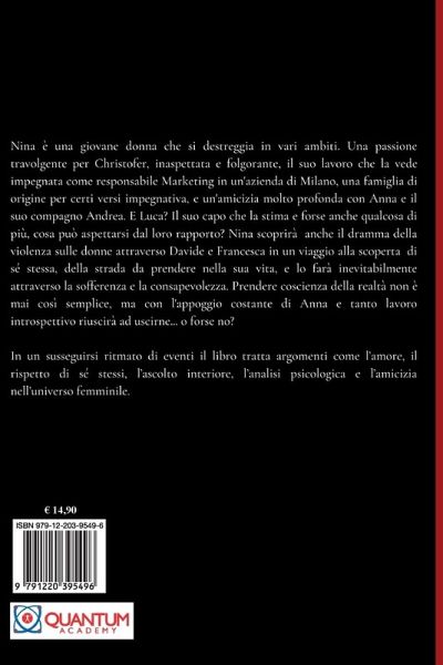 Nina è una giovane donna che si destreggia in vari ambiti. Una passione travolgente per Christofer, inaspettata e folgorante, il suo lavoro che la vede impegnata come responsabile Marketing in un'azienda di Milano, una famiglia di origine per certi versi impegnativa, e un'amicizia molto profonda con Anna e il suo compagno Andrea. E Luca' Il suo capo che la stima e forsa anche qualcosa di più, cosa può aspettarsi dal loro rapporto? Nina scoprirà anche il dramma della violenza sulle donne attraverso Davide e Francesca in viaggio alla scoperta di sè stessa, della strada da prendere nella sua vita, e lo farà inevitabilemnte attraverso la sofferenza e la consapevolezza. Prendere coscienza della realtà non è mai così semplice, ma con l'appoggio costante di Anna e tanto lavoro introspettivo riuscirà ad uscirne... o forse no? In un susseguirsi ritmato di eventi il libro tratta argomenti come l'amore, il rispetto di sè stessi, l'ascolto interiore, l'analisi psicologica e l'amicizia nell'universo femminile.