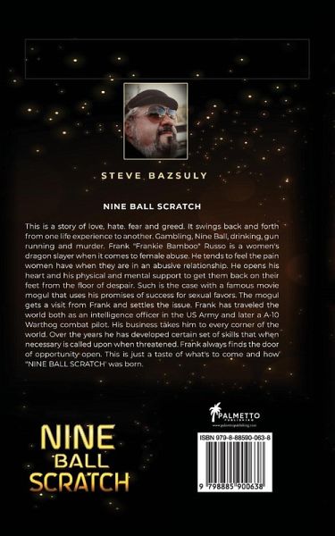 This is a story of love, hate, fear and greed. It swings back and forth from one life experience to another. Gambling, Nine Ball, drinking, gun running and murder. Frank "Frankie Bamboo" Russo is a women's dragon slayer when it comes to female abuse. He tends to feel the pain women have when they are in an abusive relationship. He opens his heart and his physical and mental support to get them back on their feet from the floor of despair. Such is the case with a famous movie mogul that uses his promises of success for sexual favors. The mogul gets a visit from Frank and settles the issue. Frank has traveled the world both as an intelligence officer in the US Army and later a A-10 Warthog combat pilot. His business takes him to every corner of the world. Over the years he has developed certain set of skills that when necessary is called upon when threatened. Frank always finds the door of opportunity open. This is just a taste of what's to come and how "NINE BALL SCRATCH" was born.