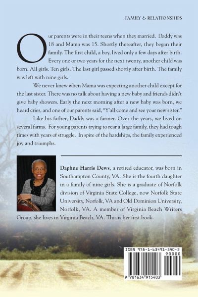 Nine Girls, No Boys is a collection of true stories of a family in rural Virginia—Daddy, Mama and nine children. All girls. For young, Black parents rearing a family during the 40s, 50s, and 60s, times were tough with years of struggle. The stories are funny, sad, and triumphant. Being sharecroppers, the family deals with sub-standard farmhouses and difficult landowners, and moves from farm to farm. Daddy and Mama yearn for their own farm. When Daddy gets his first tractor, he learns that saying "whoa" doesn't stop the tractor. He has to use the brakes. Choosing names for the girls is an ordeal. With assistance from relatives and ladies in the community, some names cause ridicule and anguish. Segregated school with long distances to walk impact the girls' education. Teen years and dating are difficult. The family has emergencies. The car door swings open as Daddy makes a left turn. One child tumbles out without being noticed. Controlled burning sets fire to the barn and forest. One child swallows an open safety pin and another is burned badly while standing in front of a pot-bellied stove. Success is achieved through perseverance, determination and hard work...