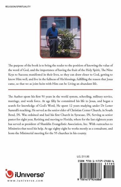 The purpose of the book is to bring the reader to the position of knowing the value of the word of God, and the importance of having the fruit of the Holy Spirit, The Nine Keys to Success; manifested in their lives, so they can draw closer to God, getting to know Him well, and live in the fullness of His blessings, fulfilling the reason that Jesus came, so that we as joint heirs with Him can be Living an abundant life.