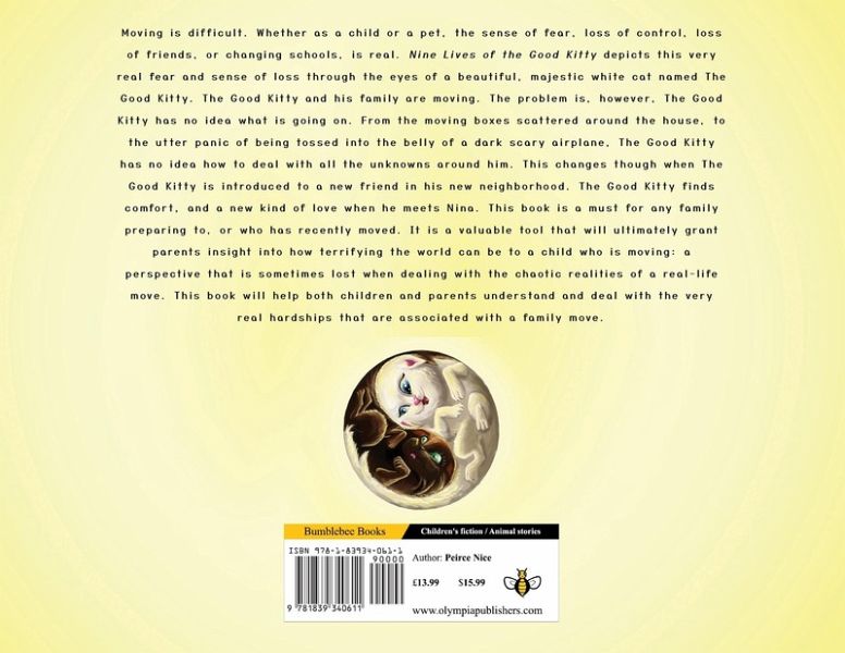 Moving is difficult. Whether as a child or a pet, the sense of fear, loss of control, loss of friends, or changing schools, is real. Nine Lives of the Good Kitty depicts this very real fear and sense of loss through the eyes of a beautiful, majestic white cat named The Good Kitty. The Good Kitty and his family are moving. The problem is, however, The Good Kitty has no idea what is going on. From the moving boxes scattered around the house, to the utter panic of being tossed into the belly of a dark scary airplane, The Good Kitty has no idea how to deal with all the unknowns around him. This changes though when The Good Kitty is introduced to a new friend in his new neighborhood. The Good Kitty finds comfort, and a new kind of love when he meets Nina. This book is a must for any family preparing to, or who has recently moved. It is a valuable tool that will ultimately grant parents insight into how terrifying the world can be to a child who is moving; a perspective that is sometimes lost when dealing with the chaotic realities of a real-life move. This book will help both children and parents understand and deal with the very real hardships that are associated with a family move.
