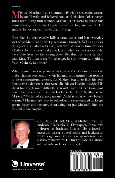 Michael Merlino lives a charmed life with a successful career, beautiful wife, and beloved son-until his dear father passes away; then things turn strange. Michael can't seem to shake this weird feeling, but maybe he just misses his dad, his mentor. He ignores the feeling that something is wrong. One day, he accidentally kills a stray cat-a sad but everyday sort of accident; he doesn't give it much thought. When another cat appears in Michael's life, however, it makes him wonder whether the stray cat really died, and whether cats actually do have nine lives, as the saying goes. But this isn't your normal stray kitty. This cat is out for revenge. Its spirit wants something from Michael, but what? When a man has everything to lose, however, it's much easier to make it happen-especially when that man is up against what appears to be a supernatural enemy. As Michael begins to face his own demons via a demon cat that won't die, his work begins to slide. His life at home gets more difficult, even with his wife there to support him. Then, there was that note his father left that told Michael to "drive it." What did the note mean? Could it possibly have been a warning? The mystery must be solved, as the reincarnated cat keeps getting bigger and meaner, threatening not just Michael's life, but his soul in the bargain.