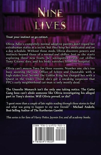Trust your instinct or go extinct. Olivia Adler's completely normal adoptive parents don't regard her extrahuman status as a secret, but they keep her medicated and on a day schedule. Without those meds, Olivia discovers powers and instincts beyond those of a normal owl shifter. Just as she starts exploring these new traits, her unrequited crush, cat shifter Tony Gitano, dies, and his body vanishes from the hospital. Olivia can't mourn Tony for three reasons. Number one, she's too busy assisting the Law Office of Ichiro and Dunstable with a high-stakes trial. Second, the Goblin King has charged her with a Quest in the Under. Third, she's got a sneaking suspicion that PPC's surly neighborhood cat-man is only mostly dead. The Unseelie Monarch isn't the only one taking notice. The Gatto Gang boss can't abide someone like Olivia investigating his alleged part in Tony's demise. Will Olivia prevail, or die? "I spent more than a couple of late nights reading through these stories to find out what was going to happen to my new friends!" - Michael Anderle, Best-Selling Author of The Kurtherian Gambit This series is for fans of Harry Potter, Jaymin Eve, and all academy books.