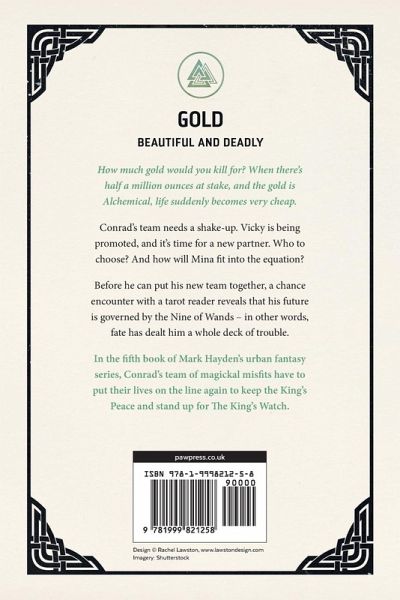 Gold. Beautiful and Deadly. And doubly deadly when you mix it with magick. Conrad and Mina take a time-out from trouble in Spain. It’s their own little Garden of Eden, until a Tarot reader tells him that his troubles have barely begun. Expelled from Paradise, Conrad and the team have to chase the trail of a new source of Alchemical Gold. A source that already has Dwarves, Gnomes and human Mages at each other’s throats. When the prize is gold, life is cheap, and nothing blinds like greed. Can Conrad keep his eyes open and see through the killing glare of gold? When the Tarot says Nine of Wands, you know you’re in for a bumpy ride.