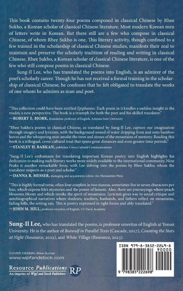 This book contains twenty-four poems composed in classical Chinese by Rhee Sukho, a Korean scholar of classical Chinese literature. Most modern Korean men of letters write in Korean. But there still are a few who compose in classical Chinese, of whom Rhee Sukho is one. This literary activity, though confined to a few trained in the scholarship of classical Chinese studies, manifests their zeal to maintain and preserve the scholarly tradition of reading and writing in classical Chinese. Rhee Sukho, a Korean scholar of classical Chinese literature, is one of the few who still compose poems in classical Chinese. Sung-Il Lee, who has translated the poems into English, is an admirer of the poet's scholarly career. Though he has not received a formal training in the scholarship of classical Chinese, he confesses that he felt obligated to translate the works of one whom he admires as man and poet.
