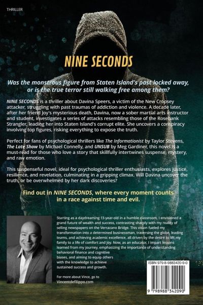 Was the monstrous figure from Staten Island's past locked away, or is the true terror still walking free among them? Dive into the gripping pages of "Nine Seconds," a thriller that resurrects the terror of an old serial attacker on Staten Island. It's a cold case. But a decade after being dismissed and gaslighted by the police and her own family, Davina Speers finds herself grappling with the haunting memories of her attack by the notorious New Cropsey. Her life, a turbulent journey through addiction, prostitution, and homelessness, takes a sharp turn when her childhood friend, Joy Sheridan, dies under mysterious circumstances labeled as suicide. Now clean, sober, and rebuilding her life as a martial arts instructor and college student, Davina's world is shattered by Joy's death and a string of chilling attacks echoing the past. Convinced that the original Rosebank Strangler was never caught, Davina embarks on a harrowing quest for justice. Her investigation lures her into the dark corridors of Staten Island's elite, where she uncovers a web of corruption involving the island's most influential figures - a banker, a politician, a police inspector, a fire commissioner, and more. As Davina delves deeper, she confronts a sinister plot that threatens to upend the lives of many, revealing secrets buried deep within the 'Forgotten Borough.' With each twist and turn, "Nine Seconds" keeps you on the edge of your seat, leading to a heart-pounding finale that will leave you breathless. Perfect for fans of psychological thrillers like "The Informationist" by Taylor Stevens, "The Late Show" by Michael Connelly, and "UNSUB" by Meg Gardiner, this novel is a must-read for those who love a story that skillfully intertwines suspense, mystery, and raw emotion. Will Davina untangle the web of lies and bring the true criminal to justice, or will the shadows of Staten Island's past consume her? Find out in "Nine Seconds," where every moment counts in a race against time and evil.