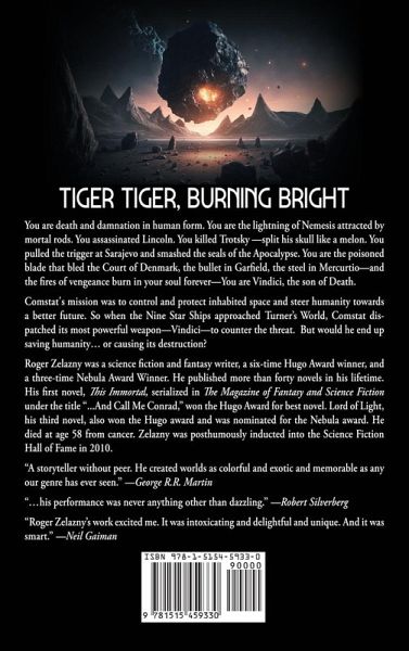 You are death and damnation in human form. You are the lightning of Nemesis attracted by mortal rods. You assassinated Lincoln. You killed Trotsky -split his skull like a melon. You pulled the trigger at Sarajevo and smashed the seals of the Apocalypse. You are the poisoned blade that bled the Court of Denmark, the bullet in Garfield, the steel in Mercutio-and the fires of vengeance burn in your soul forever.-You are Vindici, the son of Death. Comstat was tasked with guiding the human race into the future. To do that they had to maintain control of all of the inhabited planets. When Nine Star Ships approached Turner's World, the risk to Comstat was recognized and Vindici, Comstat's most powerful weapon, was dispatched to end the threat. But would he succeed in saving Comstat or would he bring its doom? Roger Zelazny was a science fiction and fantasy writer, a six-time Hugo Award winner, and a three-time Nebula Award Winner. He published more than forty novels in his lifetime. His first novel, This Immortal, serialized in The Magazine of Fantasy and Science Fiction under the title ...And Call Me Conrad won the Hugo Award for best novel. Lord of Light, his third novel, also won the Hugo award and was nominated for the Nebula award. He died at age 58 from cancer. Zelazny was posthumously inducted into the Science Fiction Hall of Fame in 2010. "A storyteller without peer. He created worlds as colorful and exotic and memorable as any our genre has ever seen." -George R.R. Martin ". . . his performance was never anything other than dazzling." -Robert Silverberg "Roger Zelazny's work excited me. It was intoxicating and delightful and unique. And it was smart." -Neil Gaiman