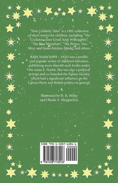 Edith Nesbit (1858 - 1924) was a prolific and popular writer of children's literature, publishing more than 60 such books under the name E. Nesbit. She was also a political activist and co-founded the Fabian Society, which had a significant influence on the Labour Party and British politics in general. "Nine Unlikely Tales" is a 1901 collection of short stories for children, including "The Cockatoucanor Great Aunt Willoughby", "The Blue Mountain", "The Prince, Two Mice, and Some Kitchen Maids", and others. These charming tales would make for perfect bedtime reading or as an introduction to the wonderful world of short stories for young readers. Illustrated by H. R. Millar and Claude A. Shepperson. Other notable works by this author include: "The Prophet's Mantle" (1885), "Something Wrong" (1886), and "The Marden Mystery" (1896). Many vintage books such as this are becoming increasingly scarce and expensive. It is with this in mind that we are republishing this volume now in an affordable, modern, high-quality edition complete with a specially-commissioned new biography of the author.
