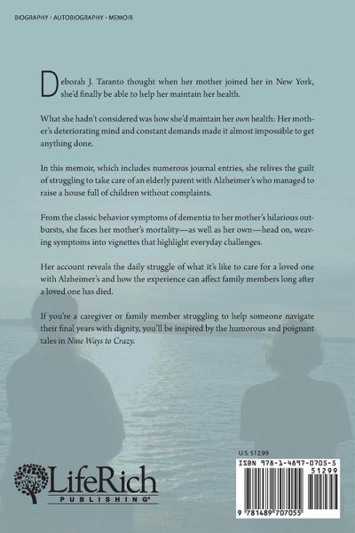 Deborah J. Taranto thought when her mother joined her in New York, she'd finally be able to help her maintain her health. What she hadn't considered was how she'd maintain her own health: Her mother's deteriorating mind and constant demands made it almost impossible to get anything done. In this memoir, which includes numerous journal entries, she relives the guilt of struggling to take care of an elderly parent with Alzheimer's who managed to raise a house full of children without complaints. From the classic behavior symptoms of dementia to her mother's hilarious outbursts, she faces her mother's mortality-as well as her own-head on, weaving symptoms into vignettes that highlight everyday challenges. Her account reveals the daily struggle of what it's like to care for a loved one with Alzheimer's and how the experience can affect family members long after a loved one has died. If you're a caregiver or family member struggling to help someone navigate their final years with dignity, you'll be inspired by the humorous and poignant tales in Nine Ways to Crazy.