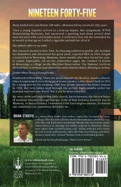 2021 Silver Medal IPPY Awards Winner for Best Regional Fiction! ¿Rusty barbed wire and distant AM radio-Montana hid my secrets for almost fifty years. Then a young reporter arrived in a beat-up Impala. Her assignment, WWII Homecoming Memories, had uncovered a puzzling lead about several dead men last seen riding a train with a red-headed nurse. I could have lied, but she reminded me of myself at that age so I rolled a cigarette and told her all of it. She spilled coffee on my table. Her research started in New York. In choosing soldiers to profile, she included her hometown and discovered her great uncle, reported MIA in 1944, bought a train ticket to Browning, Montana, three months after they buried his empty casket. Impossible, yet on two consecutive pages, she counted 14 tickets to Browning-a village on the Blackfeet Reservation. The National Archives showed that 13 of those men shared the same distinct status: Missing in Action. I know where those passengers are. Southwest of Browning, where the plains run into the Rockies, stands a church. Once it represented everything good in our country, a tiny church built in 1913 by a young man for his wedding. Only four people attended the bride's funeral in 1918. Her twin babies slept through the service. Eight months earlier her husband marched into World War I and he never returned. My story starts and ends at that little church, but in between, the darkest hours of mankind churned through Europe. Some of that darkness found its way to Montana. As bad as it ended, I wondered if the Lord forgives murder. As it turns out, sometimes yes, sometimes definitely no.