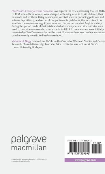 Nineteenth-Century Female Poisoners investigates the Essex poisoning trials of 1846 to 1851 where three women were charged with using arsenic to kill children, their husbands and brothers. Using newspapers, archival sources (including petitions and witness depositions), and records from parliamentary debates, the focus is not on whether the women were guilty or innocent, but rather on what English society during this period made of their trials and what stereotypes and stock-stories were used to describe women who used arsenic to kill. All three women were initially presented as 'bad' women but as the book illustrates there was no clear consensus on what exactly constituted bad womanhood.