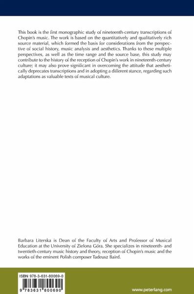This book is the first monographic study of nineteenth-century transcriptions of Chopin's music. The work is based on the quantitatively and qualitatively rich source material, which formed the basis for considerations from the perspective of social history, music analysis and aesthetics. Thanks to these multiple perspectives, as well as the time range and the source base, this study may contribute to the history of the reception of Chopin's work in nineteenth-century culture; it may also prove significant in overcoming the attitude that aesthetically deprecates transcriptions and in adopting a different stance, regarding such adaptations as valuable texts of musical culture.