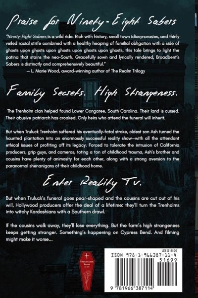 Family secrets. High strangeness. Reality TV. The Trenholm clan helped found Lower Congaree, South Carolina. Their land is cursed. Their abusive patriarch has croaked. Only heirs who attend the funeral will inherit. But when Truluck Trenholm suffered his eventually-fatal stroke, oldest son Ash turned the haunted plantation into an enormously successful reality show-with all the attendant ethical issues of profiting off its legacy. Forced to tolerate the intrusion of California producers, grip guys, and cameras, toting a ton of childhood trauma, Ash's brother and cousins have plenty of animosity for each other, along with a strong aversion to the paranormal shenanigans of their childhood home. But when Truluck's funeral goes pear-shaped and the cousins are cut out of his will, Hollywood producers offer the deal of a lifetime: they'll turn the Trenholms into witchy Kardashians with a Southern drawl. If the cousins walk away, they'll lose everything. But the farm's high strangeness keeps getting stranger. Something's happening on Cypress Bend. And filming might make it worse... Combining the literary tradition of William Faulkner, Michael McDowell, and Octavia Butler with the shimmered lunacy of John Berendt's Midnight in the Garden of Good and Evil, Elizabeth Broadbent's Ninety-Eight Sabers is a Southern Gothic novel about a family determined to stick together as history threatens to tear them apart. This is a book that asks how we live with the past-and how we accept our responsibility for it in the present.
