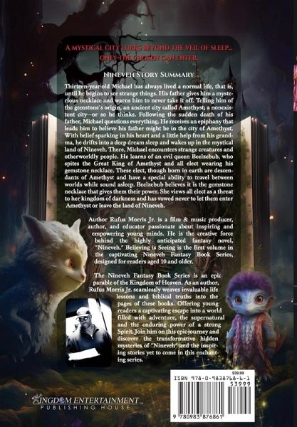 Author Bio: Rufus Morris Jr. is a film and music producer, author, and educator passionate about inspiring and empowering young minds. He is the creative force behind the highly anticipated fantasy novel, Nineveh. "Believing is Seeing" is the first volume in the captivating Nineveh Fantasy Book Series, designed for readers aged 10 and older. A native of Syracuse, New York, and now based in Atlanta, Ga. Morris's multifaceted career has been a testament to his unwavering commitment to making a positive impact. In his earlier years, he made waves in the music industry as "Skratch," releasing his first professional rap music record in 1989. As an accomplished recording artist, popular DJ and radio personality on Power 102.1FM, a radio station Morris co-owned and operated he became a neighborhood celebrity and entrepreneur, owning multiple businesses.However, as he watched his community grapple with rising crime, violence, and youth mental health issues, he realized the profound impact of the culture he was contributing to. In 2001, driven by his faith and a desire to make a positive difference, he founded the School of the heARTS Film & Music Academy, a non-profit youth training organization, and Kingdom Entertainment Studios, a film and music production company dedicated to creating positive and inspiring content through films, music, books, and other multimedia platforms. In his Nineveh Fantasy Book series, Rufus weaves a rich tapestry of lessons and messages, encompassing themes of friendship, teamwork, sacrifice, faith and overcoming fears. Readers are guided on a transformative journey that addresses issues like substance abuse, loss and empowers them to persevere in pursuing their dreams despite adversity. Rufus Morris Jr.'s passion for empowering youth shines through his work. His dedication has been recognized with program funding awards and "best practices" recognition from the New York State Education Department, Syracuse City School District and the US Department of Education. He has also collaborated with Atlanta's Fulton County Arts & Culture organization to develop Film and Music summer programs for at-risk inner-city youth. The Nineveh Fantasy Book Series is an epic parable of the Kingdom of Heaven. As an author, Rufus Morris Jr. seamlessly weaves invaluable life lessons and biblical truths into the pages of these books. Offering young readers a captivating escape into a world filled with adventure, the supernatural and the enduring power of a strong Spirit. Join him on this epic journey and discover the transformative hidden mysteries of "Nineveh" and the inspiring stories yet to come in this enchanting series.