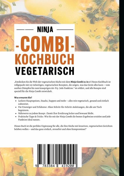 "Entdecken Sie die Welt der vegetarischen Küche mit dem Ninja Combi 12-in-1! Dieses Kochbuch ist vollgepackt mit 115 vielseitigen, vegetarischen Rezepten, die zeigen, was das Gerät alles kann - vom sanften Dämpfen bis zum knusprigen Air-Fry. Jede Funktion." ist erklärt, und alle Rezepte sind speziell für die Ninja Combi entwickelt.Was erwartet Sie?-Leckere Hauptspeisen, Snacks, Suppen und mehr - alles rein vegetarisch, gesund und einfach zubereitet.-Für Einsteiger und Erfahrene : Klare Schritt-für-Schritt-Anleitungen, die alle am Tisch begeistern.-Nährwerte zu jedem Rezept : Damit Ihre Ernährung lecker und bewusst bleibt.-Praktische Tipps & Tricks : Wie Sie mit der Ninja Combi die besten Ergebnisse erzielen und jede Funktion ideal nutzen.Dieses Buch ist die perfekte Ergänzung für alle, die ihre Küche mit kreativen, vegetarischen Gerichten beleben wollen - und das ganz einfach, stressfrei und ohne Kompromisse!"