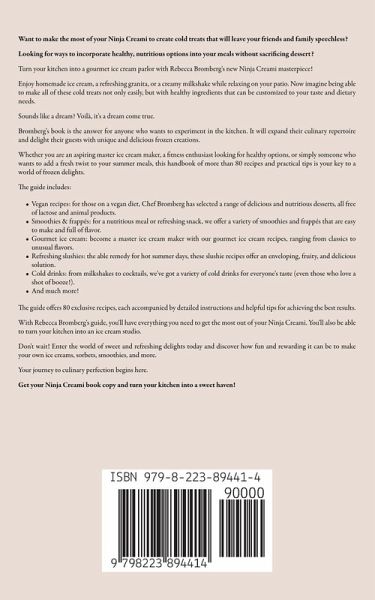 Want to make the most of your Ninja Creami to create cold treats that will leave your friends and family speechless? Looking for ways to incorporate healthy, nutritious options into your meals without sacrificing dessert? Turn your kitchen into a gourmet ice cream parlor with Rebecca Bromberg's new Ninja Creami masterpiece! Enjoy homemade ice cream, a refreshing granita, or a creamy milkshake while relaxing on your patio. Now imagine being able to make all of these cold treats not only easily, but with healthy ingredients that can be customized to your taste and dietary needs. Sounds like a dream? Voilà, it's a dream come true. Bromberg's book is the answer for anyone who wants to experiment in the kitchen. It will expand their culinary repertoire and delight their guests with unique and delicious frozen creations. Whether you are an aspiring master ice cream maker, a fitness enthusiast looking for healthy options, or simply someone who wants to add a fresh twist to your summer meals, this handbook of more than 80 recipes and practical tips is your key to a world of frozen delights. The guide includes:Vegan recipes: for those on a vegan diet, Chef Bromberg has selected a range of delicious and nutritious desserts, all free of lactose and animal products. Smoothies & frappés: for a nutritious meal or refreshing snack, we offer a variety of smoothies and frappés that are easy to make and full of flavor. Gourmet ice cream: become a master ice cream maker with our gourmet ice cream recipes, ranging from classics to unusual flavors. Refreshing slushies: the able remedy for hot summer days, these slushie recipes offer an enveloping, fruity, and delicious solution. Cold drinks: from milkshakes to cocktails, we've got a variety of cold drinks for everyone's taste (even those who love a shot of booze!). And much more! The guide offers 80 exclusive recipes, each accompanied by detailed instructions and helpful tips for achieving the best results. With Rebecca Bromberg's guide, you'll have everything you need to get the most out of your Ninja Creami. You'll also be able to turn your kitchen into an ice cream studio. Don't wait! Enter the world of sweet and refreshing delights today and discover how fun and rewarding it can be to make your own ice creams, sorbets, smoothies, and more. Your journey to culinary perfection begins here.