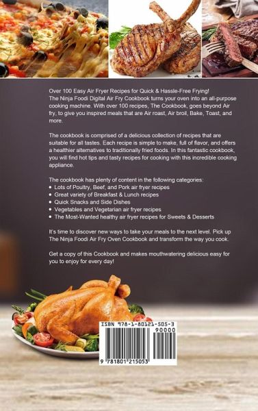 Over 100 Easy Air Fryer Recipes for Quick & Hassle-Free Frying! The Ninja Foodi Digital Air Fry Cookbook turns your oven into an all-purpose cooking machine. With over 100 recipes, The Cookbook, goes beyond Air fry, to give you inspired meals that are Air Roast, Air Broil, Bake, Dehydrate, Keep Warm, Toast, Bagel, and more. The cookbook is comprised of ¿ delicious collection of recipes that are suitable for all tastes. Each recipe is simple to make, full of flavor, and offers ¿ healthier alternatives to traditionally fried foods. In this fantastic cookbook, you will find hot tips and tasty recipes for cooking with this incredible cooking appliance. The cookbook has plenty of content in the following categories:Lots of Poultry, Beef, and Pork air fryer recipes Great variety of Breakfast & Lunch recipes Quick Snacks and Side Dishes Vegetables and Vegetarian air fryer recipes The Most-Wanted healthy air fryer recipes for Sweets & Desserts It's time to discover new ways to take your meals to the next level. Pick up The Ninja Foodi Air Fry Oven Cookbook and transform the way you cook. Get a copy of this Cookbook and makes mouthwatering delicious easy for you to enjoy for every day! Click the BUY NOW button to start your new Air Fryer lifestyle!