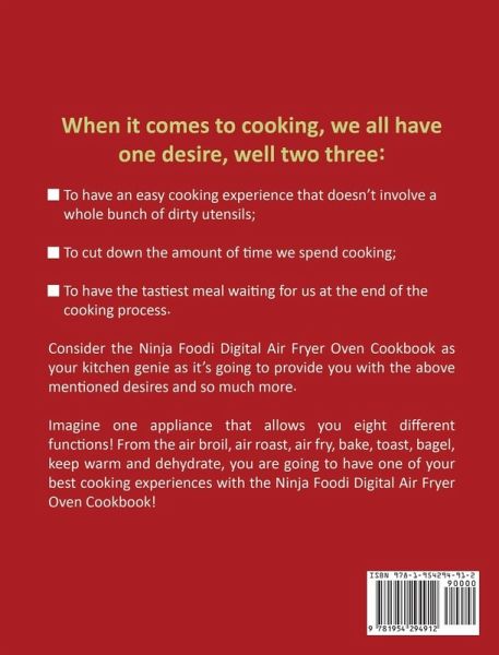 When it comes to cooking, we all have one desire, well two or three: l To have an easy cooking experience that doesn't involve a whole bunch of dirty utensils; l To cut down the amount of time we spend cooking; l To have the tastiest meal waiting for us at the end of the cooking process. Consider the Ninja Foodi Digital Air Fryer Oven Cookbook as your kitchen genie as it's going to provide you with the above mentioned desires and so much more. Imagine one appliance that allows you eight different functions! From the air broil, air roast, air fry, bake, toast, bagel, keep warm and dehydrate, you are going to have one of your best cooking experiences with the Ninja Foodi Digital Air Fryer Oven Cookbook! In the book, you will find:¿What Is Ninja Foodi Digital Air Fryer Oven? The Working Principle Various Buttons & Functions Tips for usage, Cleaning & Maintenance Matters Need Attention Easy Tasty Recipes For the recipes, you will find categories as follows:Brunches Beef, Pork, & Lamb Fish & Seafood Chicken & Poultry Vegan & Vegetarian Soups, Stews & Broths Beans and Eggs Desserts and Snacks Wait no more! Grab your copy now to live a healthy and comfortable life!