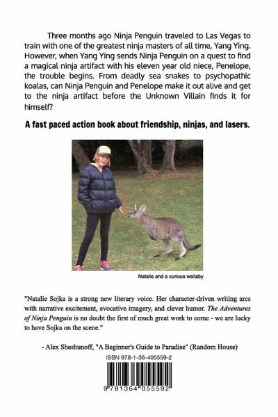 Three months ago Ninja Penguin traveled to Las Vegas to train with one of the greatest ninja masters of all time, Yang Ying. However, when Yang Ying sends Ninja Penguin on a quest to find a magical ninja artifact with his eleven year old niece, Penelope, the trouble begins. From deadly sea snakes to psychopathic koalas, can Ninja Penguin and Penelope make it out alive and get to the ninja artifact before the Unknown Villain finds it for himself? A fast paced action book about friendship, ninjas, and lasers.
