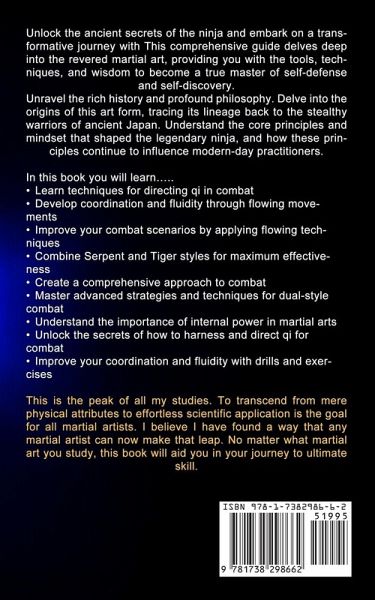 Unlock the ancient secrets of the ninja and embark on a transformative journey with This comprehensive guide delves deep into the revered martial art, providing you with the tools, techniques, and wisdom to become a true master of self-defense and self-discovery. Unravel the rich history and profound philosophy. Delve into the origins of this art form, tracing its lineage back to the stealthy warriors of ancient Japan. Understand the core principles and mindset that shaped the legendary ninja, and how these principles continue to influence modern-day practitioners. In this book you will learn.....Learn techniques for directing qi in combat Develop coordination and fluidity through flowing movements Improve your combat scenarios by applying flowing techniques Combine Serpent and Tiger styles for maximum effectiveness Create a comprehensive approach to combat Master advanced strategies and techniques for dual-style combat Understand the importance of internal power in martial arts Unlock the secrets of how to harness and direct qi for combat Improve your coordination and fluidity with drills and exercises This is the peak of all my studies. To transcend from mere physical attributes to effortless scientific application is the goal for all martial artists. I believe I have found a way that any martial artist can now make that leap. No matter what martial art you study, this book will aid you in your journey to ultimate skill.
