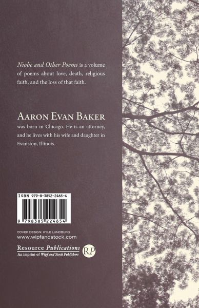 Niobe and Other Poems is a volume of poems about love, death, religious faith, and the loss of that faith. Aaron Evan Baker was born in Chicago. He is an attorney, and he lives with his wife and daughter in Evanston, Illinois.