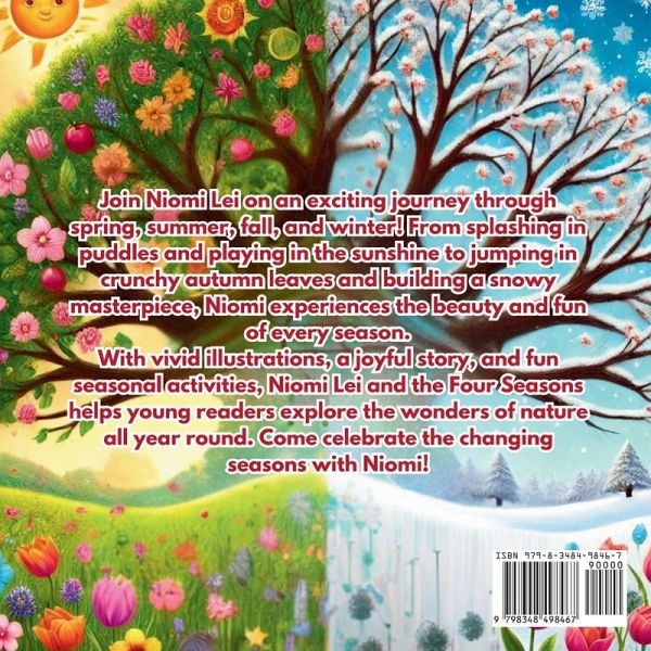 Discover the Magic of the Four Seasons with Niomi Lei! Join Niomi Lei on an exciting journey through spring, summer, fall, and winter! From splashing in puddles and playing in the sunshine to jumping in crunchy autumn leaves and building a snowy masterpiece, Niomi experiences the beauty and fun of every season. With vivid illustrations, a joyful story, and fun seasonal activities, Niomi Lei and the Four Seasons helps young readers explore the wonders of nature all year round. Come celebrate the changing seasons with Niomi!