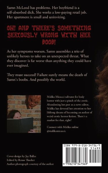 Samn McLeod has problems. Her boyfriend is a self-absorbed dick. She works a low-paying retail job. Her apartment is small and uninviting. Oh! And there's something seriously wrong with her boob! As her symptoms worsen, Samn assembles a trio of unlikely heroes to take on an unexpected threat. What they discover is far worse than anything they could have ever imagined. They must succeed! Failure surely means the death of Samn's boobs. And possibly the world. This horror romance is perfect for lovers of sci-fi, creature features, body horror, the occult, and sweet, tender love.