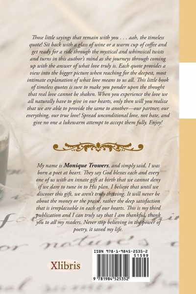 Those little sayings that remain with you . . . aah, the timeless quotes! Sit back with a glass of wine or a warm cup of coffee and get ready for a ride through the mystical and whimsical twists and turns in this author's mind as she journeys through coming up with the answer of what love truly is. Each quote provides a view into the bigger picture when reaching for the deepest, most intimate explanation of what love means to us all. This little book of timeless quotes is sure to make you ponder upon the thought that real love cannot be shaken. When you experience the love we all naturally have to give in our hearts, only then will you realize that we are able to provide the same to another-our partner, our everything, our true love! Spread unconditional love, not hate, and give no one a lukewarm attempt to accept them fully. Enjoy!