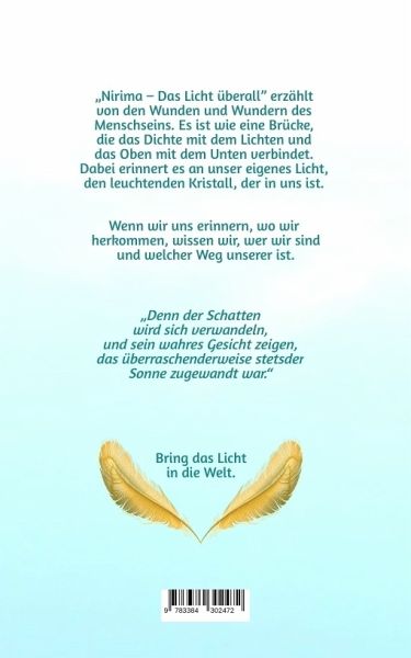 "Nirima - Das Licht überall" erzählt von den Wunden und Wundern des Menschseins. Es ist wie eine Brücke, die das Dichte mit dem Lichten und das Oben mit dem Unten verbindet. Dabei erinnert es an unser eigenes Licht, den leuchtenden Kristall, der in uns ist. Wenn wir uns erinnern, wo wir herkommen, wissen wir, wer wir sind und welcher Weg unserer ist. "Denn der Schatten wird sich verwandeln, und sein wahres Gesicht zeigen, das überraschenderweise stets der Sonne zugewandt war."Bring das Licht in die Welt.Eine Leserin schreibt: "Text 22 ist wieder so ein Meisterwerk, was durch dich den Weg aufs Papier gefunden hat und damit in die Welt hinein, damit wir anderen es sehen können."Text 22 "In die neue Welt" ist ein stiller und zugleich kraftvoller Text, der den Weg vom Rand der Gesellschaft in die neue Welt geht. Auch von den anderen Texten des Buches kannst du dich berühren lassen - doch in Wirklichkeit ist es dein eigenes Inneres, das du spüren wirst. So lädt dich ein Wandererein, ein Stück mit ihm zu gehen, in einem anderen Text geht es "In die Tiefe und wieder hinauf" und nachdem sich das "Licht unter dem Scheffel" hervor getraut hat, kannst du das Herzstück des Buches - die wunderbar magische Geschichte vom "Licht" lesen.
