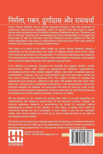 Nirmala, Gaban, Durgadas Aur Ramcharcha This book is a result of an effort made by us towards making a contribution to the preservation and repair of original classic literature. In an attempt to preserve, improve and recreate the original content, we have worked towards: 1. Type-setting & Reformatting: The complete work has been re-designed via professional layout, formatting and type-setting tools to re-create the same edition with rich typography, graphics, high quality images, and table elements, giving our readers the feel of holding a 'fresh and newly' reprinted and/or revised edition, as opposed to other scanned & printed (Optical Character Recognition - OCR) reproductions. 2. Correction of imperfections: As the work was re-created from the scratch, therefore, it was vetted to rectify certain conventional norms with regard to typographical mistakes, hyphenations, punctuations, blurred images, missing content/pages, and/or other related subject matters, upon our consideration. Every attempt was made to rectify the imperfections related to omitted constructs in the original edition via other references. However, a few of such imperfections which could not be rectified due to intentional\unintentional omission of content in the original edition, were inherited and preserved from the original work to maintain the authenticity and construct, relevant to the work. We believe that this work holds historical, cultural and/or intellectual importance in the literary works community, therefore despite the oddities, we accounted the work for print as a part of our continuing effort towards preservation of literary work and our contribution towards the development of the society as a whole, driven by our beliefs. We are grateful to our readers for putting their faith in us and accepting our imperfections with regard to preservation of the historical content. HAPPY READING!