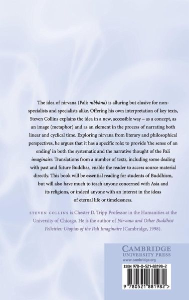 The idea of nirvana (Pali nibb¿na) is alluring but elusive for non-specialists and specialists alike. Offering his own interpretation of key texts, Steven Collins explains the idea in a new, accessible way - as a concept, as an image (metaphor), and as an element in the process of narrating both linear and cyclical time. Exploring nirvana from literary and philosophical perspectives, he argues that it has a specific role: to provide 'the sense of an ending' in both the systematic and the narrative thought of the Pali imaginaire. Translations from a number of texts, including some dealing with past and future Buddhas, enable the reader to access source material directly. This book will be essential reading for students of Buddhism, but will also have much to teach anyone concerned with Asia and its religions, or indeed anyone with an interest in the ideas of eternal life or timelessness.