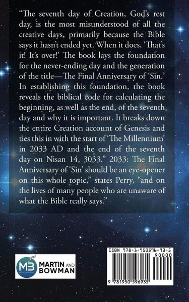 "The seventh day of Creation, God's rest day, is the most misunderstood of all the creative days, primarily because the Bible says it hasn't ended yet. When it does, 'That's it! It's over!' The book lays the foundation for the never-ending day and the generation of the title-The Final Anniversary of 'Sin.' In establishing this foundation, the book reveals the biblical code for calculating the beginning, as well as the end, of the seventh day and why it is important. It breaks down the entire creation account of Genesis and ties this in with the start of the millennium in 2033 AD and the end of the seventh day on Nisan 14, 3033. 2033: The Final Anniversary of 'Sin' should be an eye-opener on this whole topic," states Perry, "and on the lives of many people who are unaware of what the Bible really says."