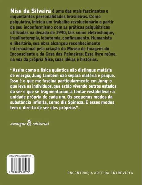 Encontros (Meetings) is the largest and most prestigious book collection of interviews with Brazilian artists and thinkers. With more than 50 published titles, Encontros provides a broad panorama of Brazil's cultural and intellectual wealth. Nise da Silveira is one of the most fascinating and restless Brazilian personalities. As a psychiatrist, she started a revolutionary work based on her non-conformism with the psychiatric practices used in the 1950s, such as electroshock, insulin therapy, lobotomy and confinement. Humanistic and libertarian, her work has achieved international recognition for the creation of the Museum of Images of the Unconscious and the Casa da Palmeiras. This book brings together, in the voice of Nise herself, her ideas and personal trajectory.
