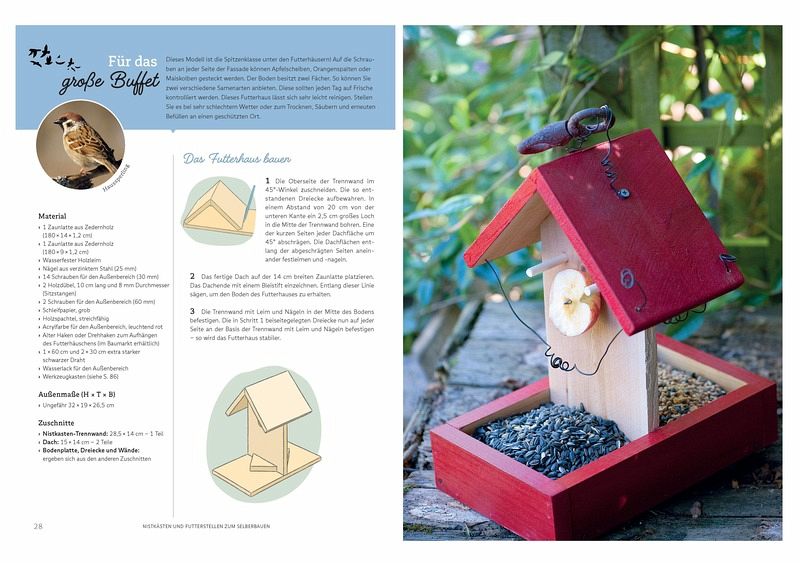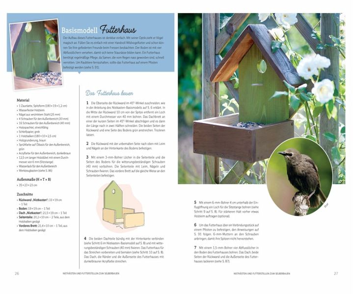 Heimische Vögel sind nicht nur schön anzusehen, sie sind auch unverzichtbare Helfer bei der Beseitigung von Pflanzenschädlingen und Ungeziefer. Um die gefiederten Freunde willkommen zu heißen, bietet dieses Buch über 10 verschiedene Anleitungen zum Bau von Nistkästen und Futterhäuschen aus Holz, in unterschiedlichen Größen und Formen und mit verschiedenen Deko-Materialien. Zudem werden 50 Gartenvögel mit Foto und Steckbrief vorgestellt und ihr Lebensraum, Verhalten, Nahrung und alles rund um die Brutzeit erklärt.