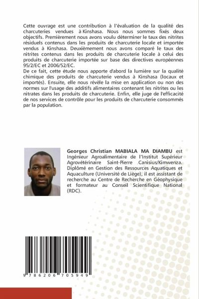 Cette ouvrage est une contribution à l'évaluation de la qualité des charcuteries vendues à Kinshasa. Nous nous sommes fixés deux objectifs. Premièrement nous avons voulu déterminer le taux des nitrites résiduels contenus dans les produits de charcuterie locale et importée vendus à Kinshasa. Deuxièmement nous avons comparé le taux des nitrites contenus dans les produits de charcuterie locale à celui des produits de charcuterie importée sur base des directives européennes 95/2/EC et 2006/52/EC. De ce fait, cette étude nous apporte d'abord la lumière sur la qualité chimique des produits de charcuterie vendus à Kinshasa (locaux et importés). Ensuite, elle nous révèle la mise en application ou non des normes sur l'usage des additifs alimentaires contenant les nitrites ou les nitrates dans les produits de charcuterie. Enfin, elle juge de l'efficacité de nos services de contrôle pour les produits de charcuterie consommés par la population.