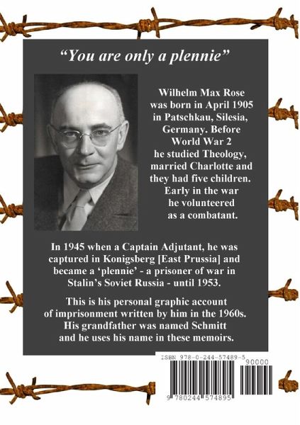 "You are only a plennie" Wilhelm Max Rose was born in April 1905 in Patschkau, Silesia, Germany. Before World War 2 he studied Theology, married Charlotte and they had five children. Early in the war he volunteered as a combatant. In 1945 when a Captain Adjutant, he was captured in Konigsberg [East Prussia] and became a 'plennie' - a prisoner of war in Stalin's Soviet Russia - until 1953. This is his personal graphic account of imprisonment written by him in the 1960s. His grandfather was named Schmitt and he uses his name in these memoirs.