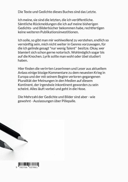 Die Texte und Gedichte dieses Buches sind das Letzte.Ich meine, sie sind die letzten, die ich veröffentliche. Sämtliche Rückmeldungen die ich auf meine bisherigen Gedichts- und Bilderbücher bekommen habe, rechtfertigen keine weiteren Publikationsinvestitionen.Ich solle, so gibt man mir wohlwollend zu verstehen, endlich so vernünftig sein, mich nicht weiter in Genres vorzuwagen, für die ich gelinde gesagt "nur wenig Talent" besitze. Okay, wer blamiert sich schon gerne notorisch. Wohlmöglich sogar bis auf die Knochen. Lyrik sollte man wohl oder übel studiert haben. Hier finden die verirrten Leserinnen und Leser aus aktuellem Anlass einige bissige Kommentare zu dem neuesten Krieg in Europa und der mit seinem Beginn verloren-gegangenen Pluralität der Meinungen in den Medien auf diesem Kontinent, der irgendwie inkontinent geworden zu sein scheint. Alles läuft vorbei und geht in die Hose. Die Mehrzahl der Gedichte und Bilder sind aber - wie gewohnt - Auslassungen über Pillepalle.