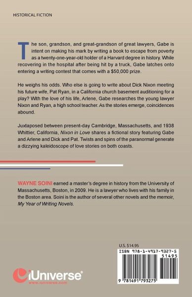 The son, grandson, and great-grandson of great lawyers, Gabe is intent on making his mark by writing a book to escape from poverty as a twenty-one-year-old holder of a Harvard degree in history. While recovering in the hospital after being hit by a truck, Gabe latches onto entering a writing contest that comes with a $50,000 prize. He weighs his odds. Who else is going to write about Dick Nixon meeting his future wife, Pat Ryan, in a California church basement auditioning for a play? With the love of his life, Arlene, Gabe researches the young lawyer Nixon and Ryan, a high school teacher. As the stories emerge, coincidences abound. Juxtaposed between present-day Cambridge, Massachusetts, and 1938 Whittier, California, Nixon in Love shares a fictional story featuring Gabe and Arlene and Dick and Pat. Twists and spins of the paranormal generate a dizzying kaleidoscope of love stories on both coasts.
