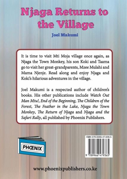 It is time to visit Mti Moja village once again, as Njaga the Town Monkey, his son Koki and Taama go to visit her great-grandparents, Mzee Mulahi and Mama Njenje. Read along and enjoy Njaga and Koki's hilarious adventures in the village.