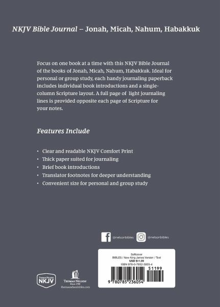 A unique Scripture-engagement format with room to write notes and prayers, ideally suited for following a sermon series in church, participating in small-group study, or for individual devotional and study time. Focus on one book at a time with this NKJV Bible Journal of the books of Jonah, Micah, Nahum, and Habakkuk. Ideal for personal or group study, each handy journaling paperback includes individual book introductions and a single-column Scripture layout with a full page of light journaling lines opposite each page of Scripture. Features include: * Full-lined pages next to Scripture provide plenty of space to reflect, journal, or create art next to your favorite verses * Premium paper limits bleed-through, ideal for taking notes * Flexible sewn binding helps the journal to lay flat in your hand or on your desk * Book introductions provide a concise overview of the background and historical context of the book about to be read * Translation notes provide a look into the thinking of the translators with alternative translations that could have been used and textual notes about manuscript variations * Handheld size allows you to take God's Word wherever life takes you - work, small group, church, or anywhere else * Clear and readable 12-point NKJV Comfort Print(R)