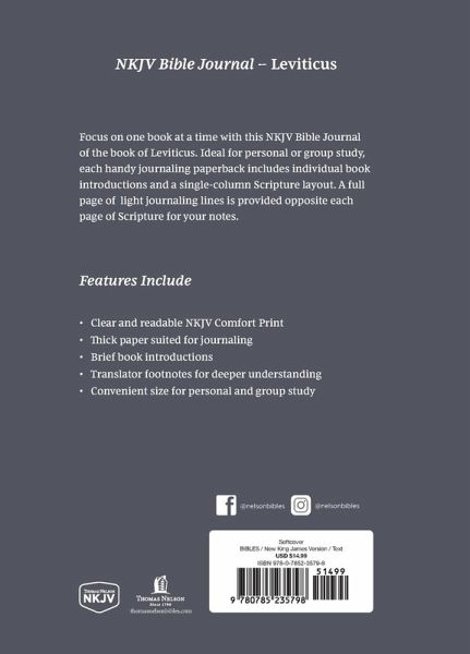 A unique Scripture-engagement format with room to write notes and prayers, ideally suited for following a sermon series in church, participating in small-group study, or for individual devotional and study time. Focus on one book at a time with this NKJV Bible Journal of the books of Leviticus. Ideal for personal or group study, each handy journaling paperback includes individual book introductions and a single-column Scripture layout with a full page of light journaling lines opposite each page of Scripture. Features include: * Full-lined pages next to Scripture provide plenty of space to reflect, journal, or create art next to your favorite verses * Premium paper limits bleed-through, ideal for taking notes * Flexible sewn binding helps the journal to lay flat in your hand or on your desk * Book introductions provide a concise overview of the background and historical context of the book about to be read * Translation notes provide a look into the thinking of the translators with alternative translations that could have been used and textual notes about manuscript variations * Handheld size allows you to take God's Word wherever life takes you - work, small group, church, or anywhere else * Clear and readable 12-point NKJV Comfort Print(R)